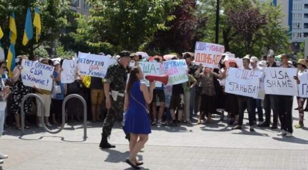 Сегодня в Киеве прошла акция протеста против политики США в отношении Украины. Сотни людей собрались у здания посольства Соединенных Штатов с требованием прекратить вмешиваться во внутренние дела страны и остановить кровопролитие на Донбассе.
